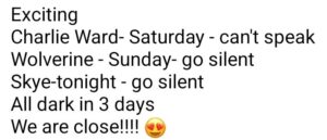 彼女は、私たちは終わりに近づいていて、10日間の暗闇は1週間以内だと言われました!とても興奮する!スカイは沈黙!すごい!C. ウルヴァリン