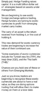 エキゾチックな外国為替オプション取引も見られ始めている。ヘッジファンドは新興市場のキャリートレードから利益を得るためにエキゾチック通貨に目を向けています。