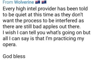 すべての高い情報提供者は、まだ悪いリンゴ(人々)がいるので、プロセスが妨害されることを望まないので、現時点では静かにするように言われている。