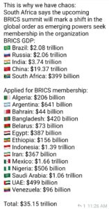 B. そのため、混乱が起きている:南アフリカは、新興国がBRICS GDP(国内総生産)への加盟を目指す中、来るBRICSサミットは世界秩序の転換を意味すると述べている: