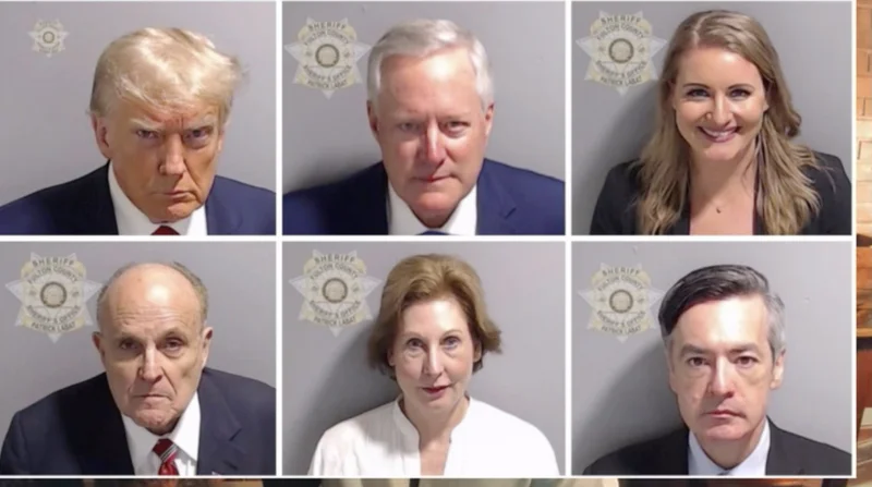 マーク・メドウズ、シドニー・パウエル、ジェナ・エリス、そして弁護士、全員が灰色のスクリーンの前に立ち、頭の左上から降り注ぐ光で大きな影を作っている。