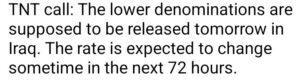 B.  TNTコール 低額紙幣は明日イラクで発売されることになっている。レートは72時間以内に変わるでしょう。