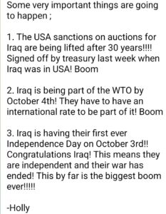 イラクの通貨リセット関連する情報がホリー氏、アリエル氏の情報が紹介されています。