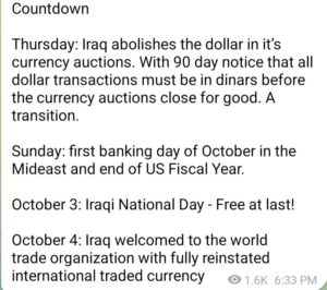 イラクは通貨リセットに向けて、10月3日に独立記念日を制定し10月4日にはWTOに加盟が予定されています。