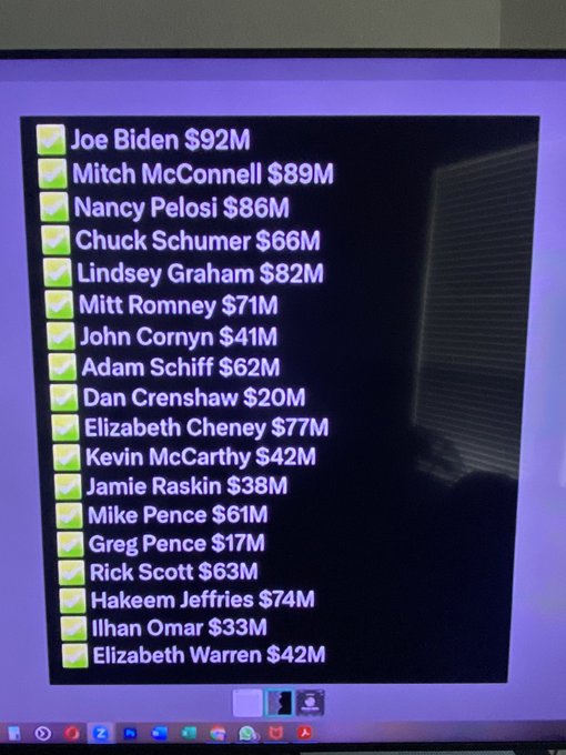 上位者は、グラハム8200万ドル、バイデン9200万ドル、マコーネル8900万ドル、ペロシ8600万ドル、ペンス6100万ドルです。