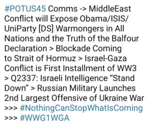 Potus45(トランプ大統領)の通信–中東紛争は、すべての国のオバマ/ISIS/ユニパーティー(ディープ・ステート)の戦争屋とバルフォア宣言の真実を暴露するでしょう。
