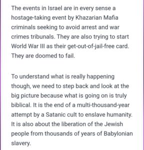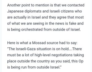 それは、人類を奴隷化しようとする悪魔崇拝カルトによる数千年にわたる試みの終わりである。それはまた、何千年にもわたるバビロニアの奴隷状態からのユダヤ人の解放でもある。B. もうひとつ言っておくと、私たちはイスラエルに実際にいる日本の外交官やイスラエル人にコンタクトを取ったが、彼らが同意したのは、私たちがニュースで目にしていることのほとんどはフェイクであり、イスラエルの外から仕組まれたものだということです。