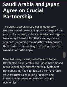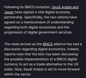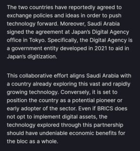 その後、これらの国々は独自の技術の進化の開発に取り組んでいます。現在、サウジアラビアと日本はBRICS圏への加盟を承認される可能性が高いことを受けて、重要なデジタル経済パートナーシップに署名した。