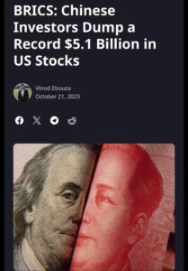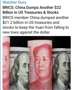 BRICSのメンバーである中国は、人民元が対ドルで最安値を更新するのを防ぐため、米国債と株式をさらに212億ドル投売りした。