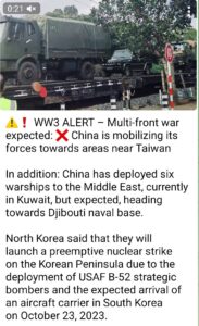 そして、イスラエル情勢の関係から、米国の核実験と中国の台湾侵攻に対して記述されて、第三次世界大戦危機が迫るかのような動きです。