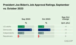 木曜日に発表されたギャラップ世論調査によると、民主党のジョー・バイデンに対する支持率は過去数週間で11ポイント低下し、バイデン大統領任期で最低となった。