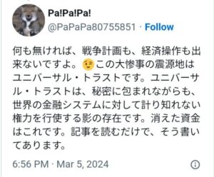 愛国者はトランプの偽暗殺に備えろ、メディアはトランプが自分の飛行機で亡くなったと言うだろう ブラックハットにはトランプのクローンがいる。彼らはこのクローンを殺すつもりだ。メディアは大騒ぎするだろう。言葉を信じないでください。トランプはすでに知っている、トランプは安全だ https://t.co/C0laphrpcN— とにかく明るい未来予想図‼️ (@crypt_QFS) March 5, 2024