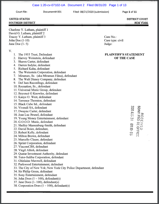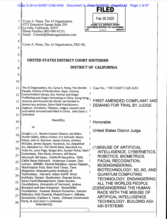 [1]完全な訴訟–キプロスA.パルサ、AI組織対Google他以下に、2020年2月26日のキプロスA.パルサ、AI組織対グーグルらによって提起された関連する確認済みの進行中の訴訟を示します。これに関連して、レイサム家とエプスタインの「1953トラスト」に対して別の注目すべき訴訟が提起され、2021年2月1日に更新されました。この訴訟は、子供がどのように購入、販売、商品として使用されたかを示しています。高レベルのルシフェリアの小児性愛者エリートとそれぞれに関連するメディア企業およびレコードラベル。以下に示す完全な訴訟は、性的暴行、セクハラ、虐待、レイプ、拷問、恐喝、搾取、恐喝、人身売買。