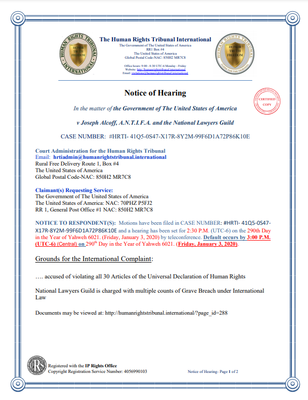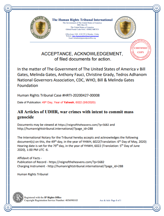 同様に、ANTIFA、CDC、Fauci、Gates Foundation、Nationalを含む大量虐殺を行うための戦争犯罪を含む世界人権宣言(UDHR)の30の記事すべての違反に関連して、国際刑事裁判所のWebサイトに多数の文書が公開されています。弁護士ギルド、全国知事協会、ロスチャイルドファミリー、およびWHO。[2]完全な文書–国際刑事裁判所vs.ゲイツ他