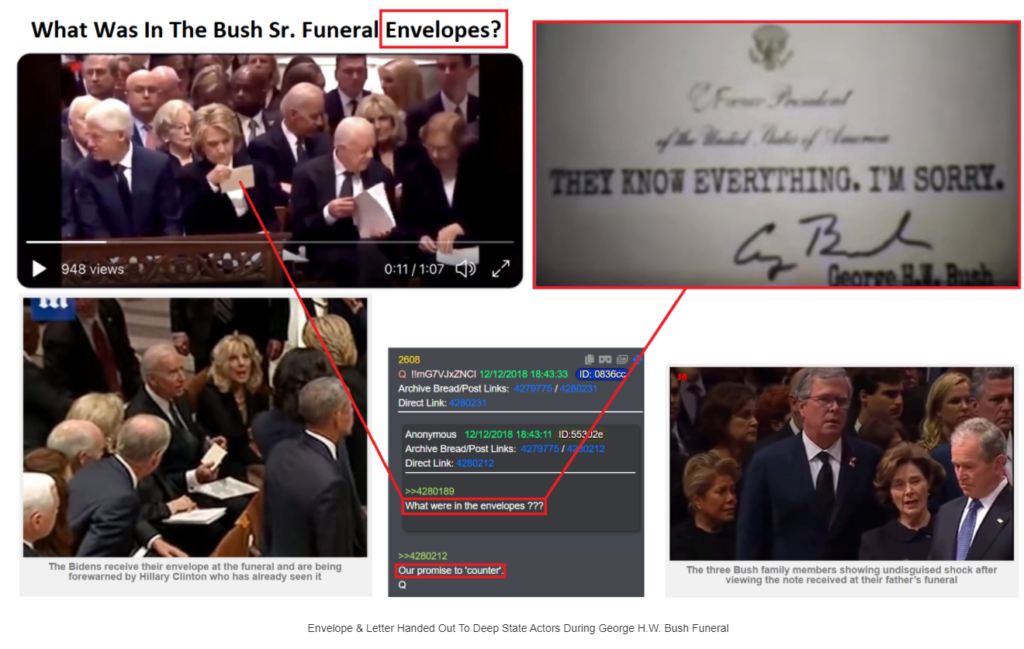 これらのディープステートエリートの多くは、ジョージHWブッシュの葬式で配られた秘密の封筒を介して迫り来る逮捕の警告を与えられました。次のビデオと画像は、手紙を受け取った人の何人かと、手紙が正確に何を言っているかを示しています。本質的に、ジョージHWブッシュは、彼の人権法廷(アナログで撮影された)のすべてを告白しました。