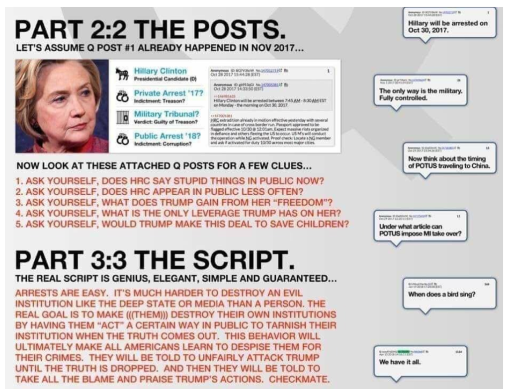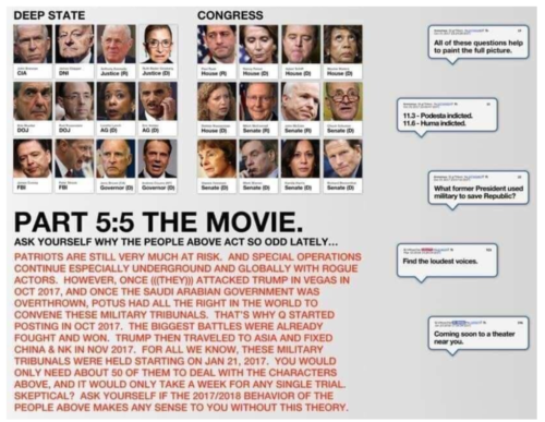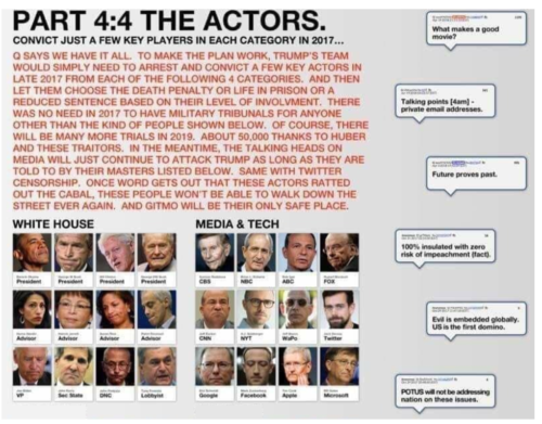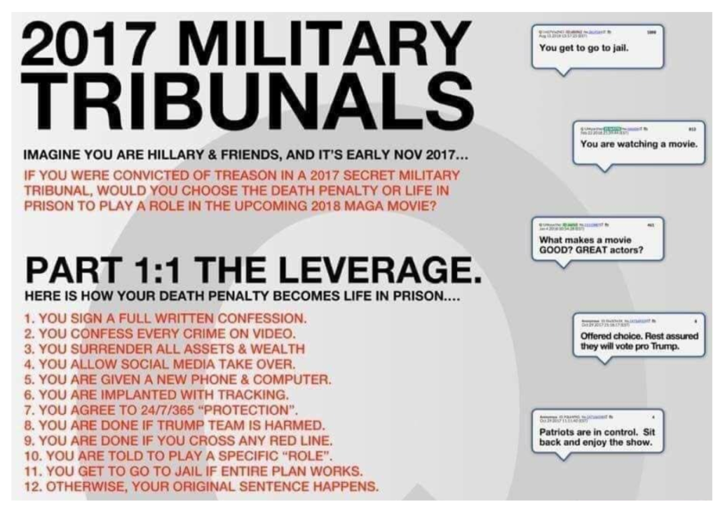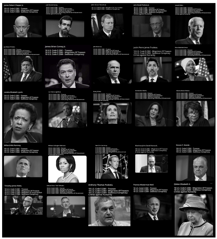 起訴状に名前が挙がっている世界的および政治的エリートの中には、連邦裁判所で裁かれる者もいれば、GITMO で軍事法廷にかけられる者もいれば、国際法廷で裁かれる者もいます。