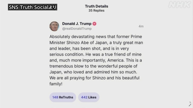 日本時間の午後2時前、ソーシャルメディアへの投稿で「真にすばらしい人物であり、指導者である安倍元総理大臣が銃撃を受け、とても深刻な状態にあるという極めて衝撃的な知らせが入ってきた。