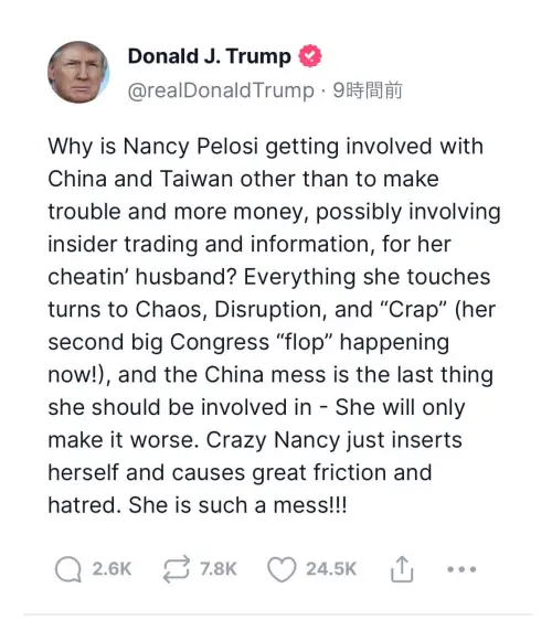 (引用先:トランプ大統領「ペロシはなぜ中国や台湾に関与しているのか。インサイダー取引を含めて、彼女の不正直な夫のために金を作るためか?」/ペロシ夫妻にインサイダー取引疑惑)