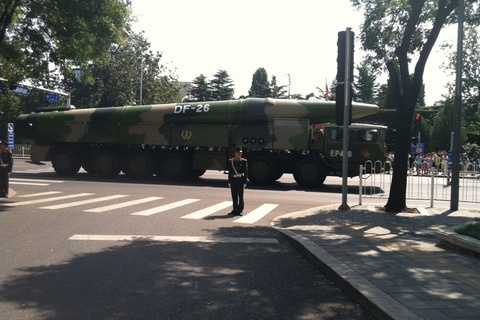 トランスポーター/エクタ/ランチャー(TEL)トラックに搭載された中国のDF-26ミサイルです。(筆者注釈:「DF-26」は2015年北京で開催した対日戦勝記念パレードで“グアム・エクスプレス(Guam Express)”として紹介されたミサイルである。