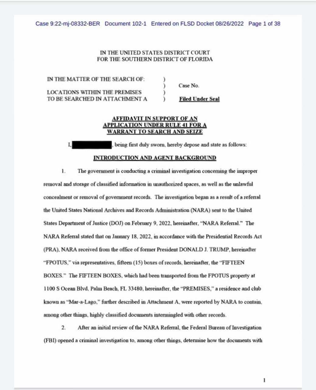*Not* the affidavit, but the government’s legal memo making the case for redacting the affidavit was also unsealed and it’s… heavily redacted. pic.twitter.com/ygJmSTflLZ