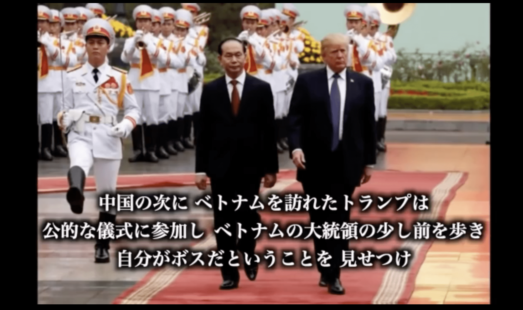 中国の次に、ベトナムを訪れたトランプは公的な儀式に参加し、ベトナムの大統領の少し前を歩き自分がボスだということを見せつけ、ベトナム大統領にもう人身売買のために子供たちを調達するのを止めるよう約束させました。