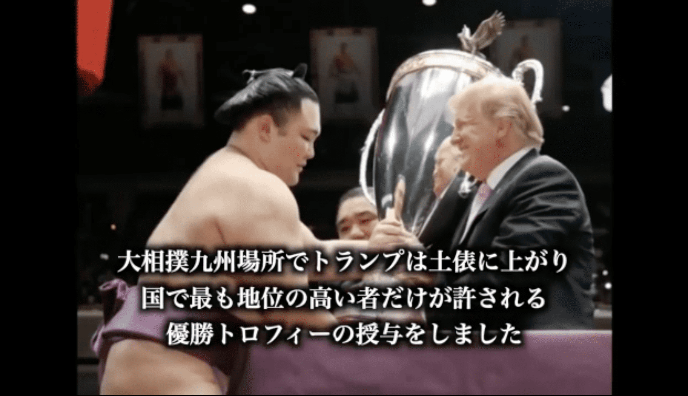 動画では、この時に大相撲千秋楽でトランプ大統領が優勝杯の授与を行なったとして紹介しています。