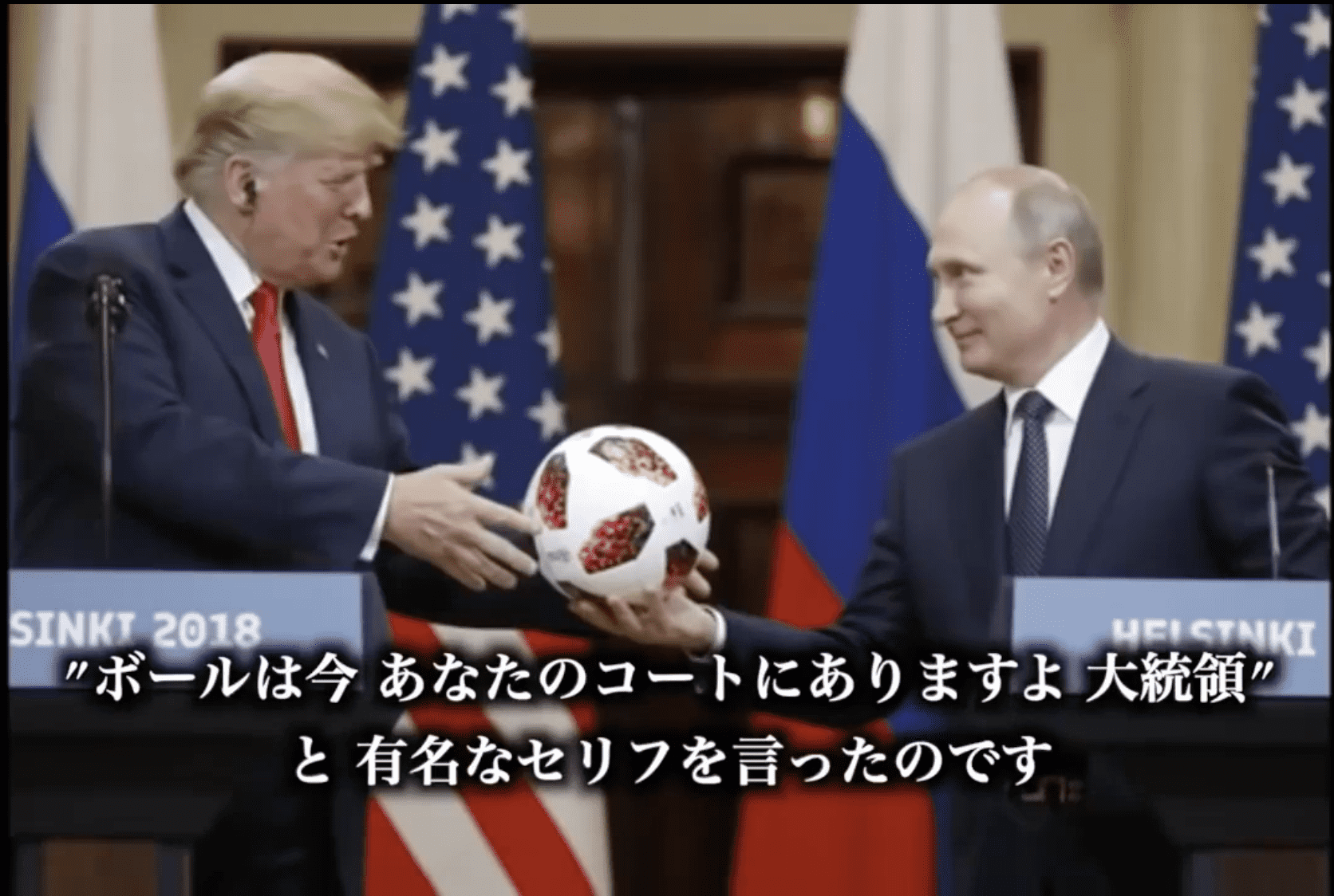 プーチンがトランプに公の会議場でサッカーボールを渡し、”ボールは今あなたのコートにありますよ”・・・つまりプーチンは、私はあなたと同じチームです。