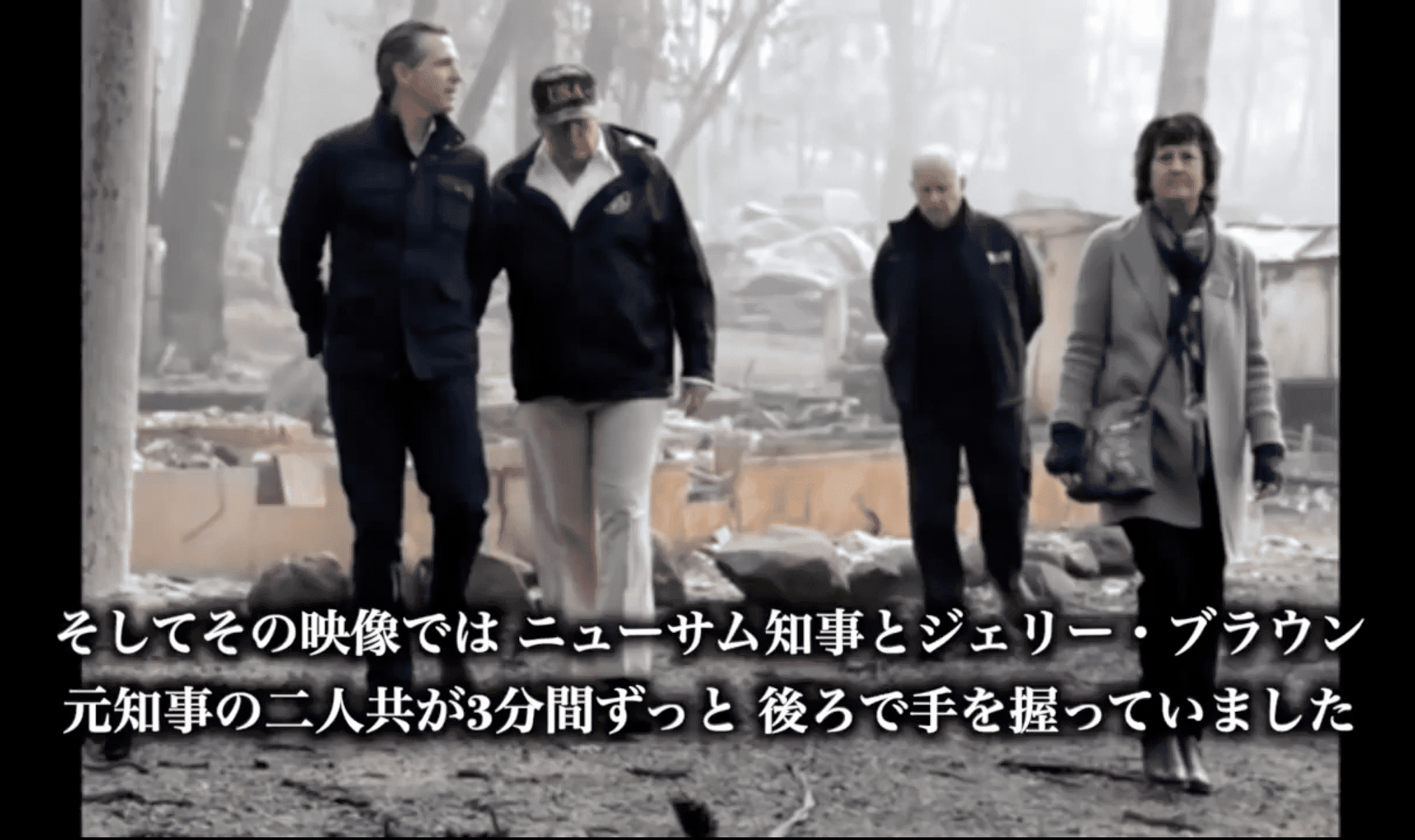 そしてその映像では、ニューサム知事とジェリー・ブラウン元知事の二人が3分間ずっと後ろで手を握っていました。