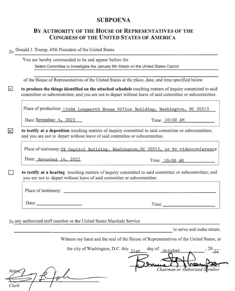 トランプ氏への召喚状では、11 月 4 日までに書類を提出し、11 月 14 日前後に宣誓供述書を提出する必要がある。