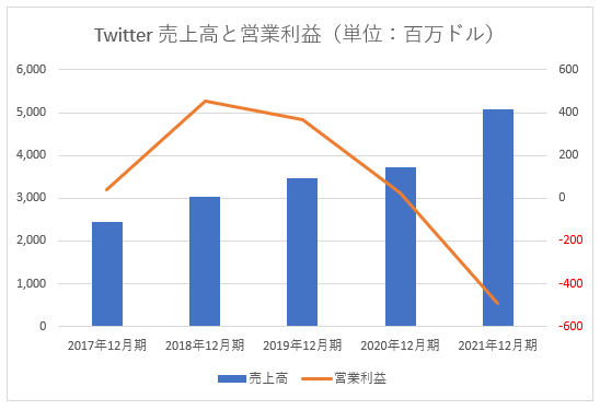 Twitterの業績はパッとしません。2021年12月期は営業赤字に転落しました。
