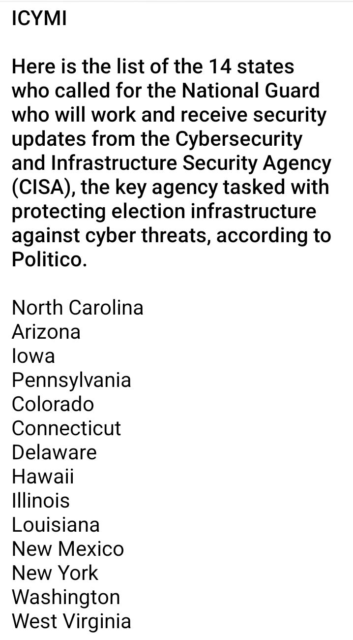 2. 噂では、州軍のサイバーセキュリティチームが14州で今回の中間選挙を見張っていたと言われていますが実は全く別の場所で今回の中間選挙を見張っていました。(情報ではこの下に書いてある14州でサイバー脅威から選挙インフラを保護していると言われていた州です。)