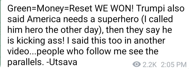 緑=お金=リセット 私達の勝利です! トランプはまた、アメリカにはスーパーヒーローが必要だと言いました (私は先日彼をヒーローと呼びました)。