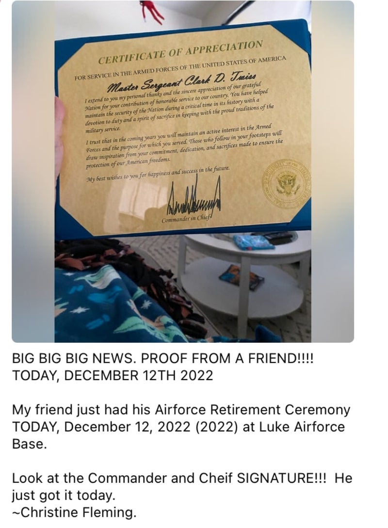 2022年12月12日に退役した軍人の退所式の総司令官の署名欄に、ドナルド・J・トランプの署名がある画像が紹介されていました。