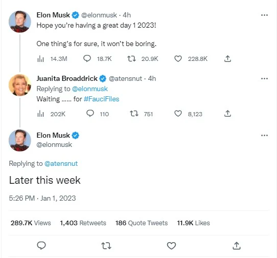 イーロン・マスク: ファウチのファイルが今週後半にドロップ予定 – 2023 年が面白くなりそうです!