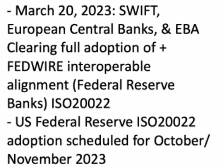 2023年10月または11月に予定されている米国連邦準備制度理事会 ISO20022 の採用。簡単に言えば、今まで古い金融システムで使っていた送金システムや資金の移動システムがクワンタム経済・金融システムと統合される日が2023年3月20日になると言うことです。