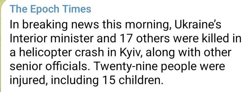 今朝のニュース速報では、ウクライナの内務大臣と17人の他の高官がキエフでのヘリコプターの墜落事故で死亡しました。
