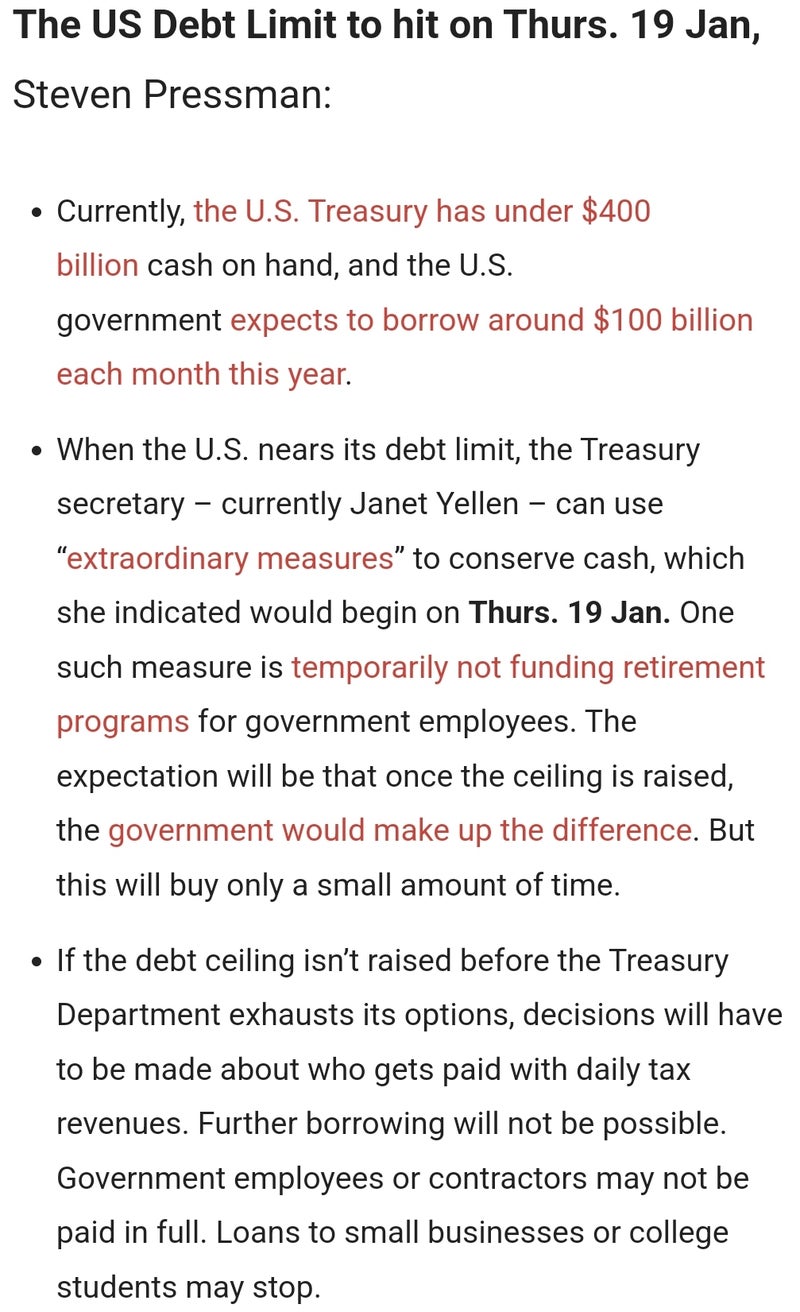 米国が債務上限に近づくと、財務長官(現在のジャネット・イエレン)は現金を節約するために「特別な措置」を講じることができ、それは1月19日木曜日から開始されると彼女は示唆した。