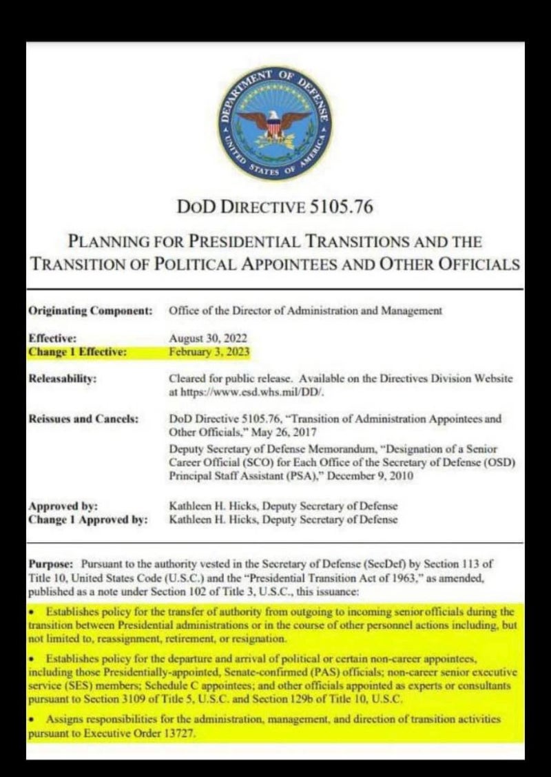 変更点1 施行日:2023年2月3日目的:合衆国法典第10編第113節および「1963年大統領移行法」の改正により国防長官(SecDef)に付与された権限に基づき、国防長官(SecDef)は、合衆国法典第10編第102節の注釈として公表された。