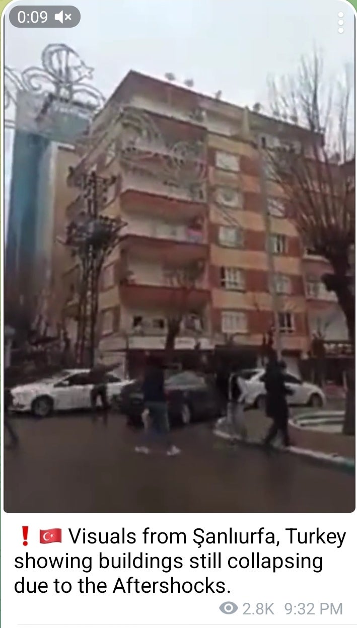 B. C. D. トルコのシャンルウルファで撮影された、余震で建物が倒壊している映像。