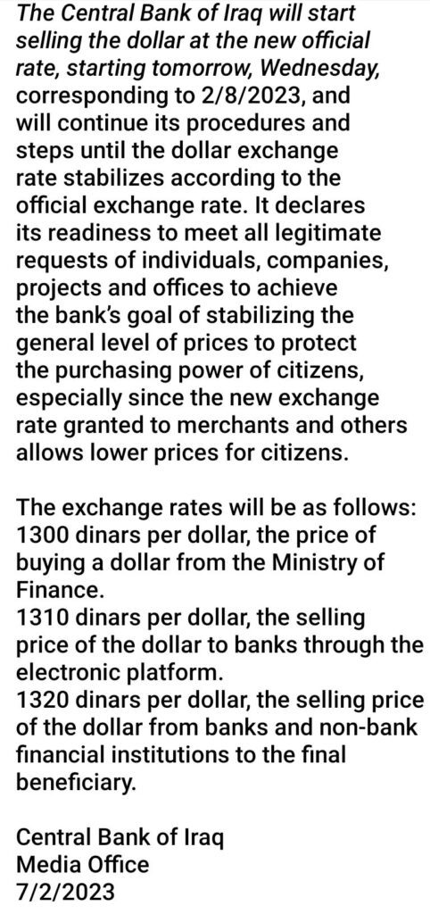 C. イラク中央銀行は、明日2023/02/08(水)から新しい公式為替レートでのドル売りを開始する予定です。