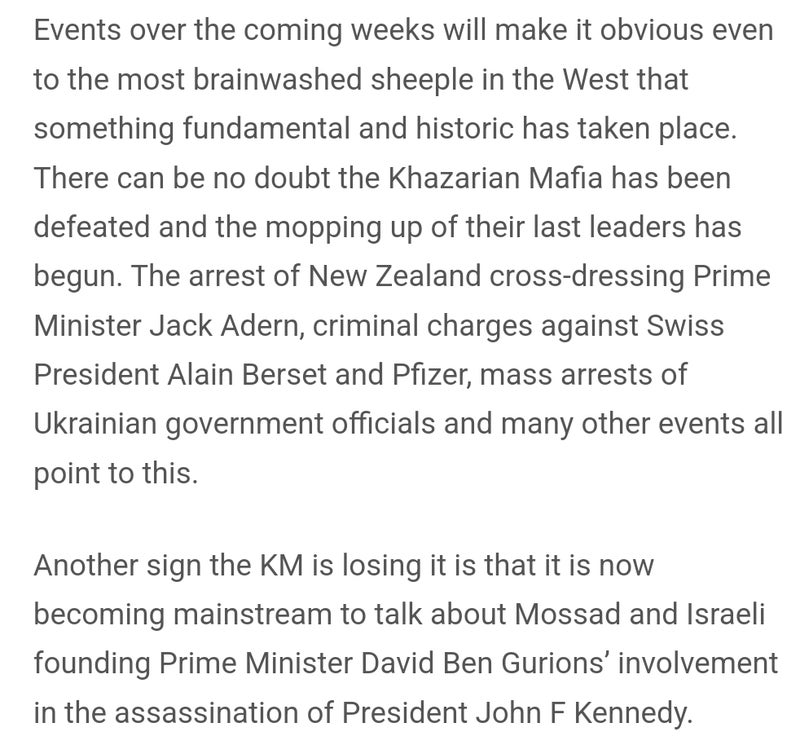 ニュージーランドのクロスドレッシング首相ジャック・アダーンの逮捕、スイスのアラン・ベルセ大統領とファイザーに対する刑事告発、ウクライナ政府高官の大量逮捕、その他多くの出来事はすべてこれを示しているのです。