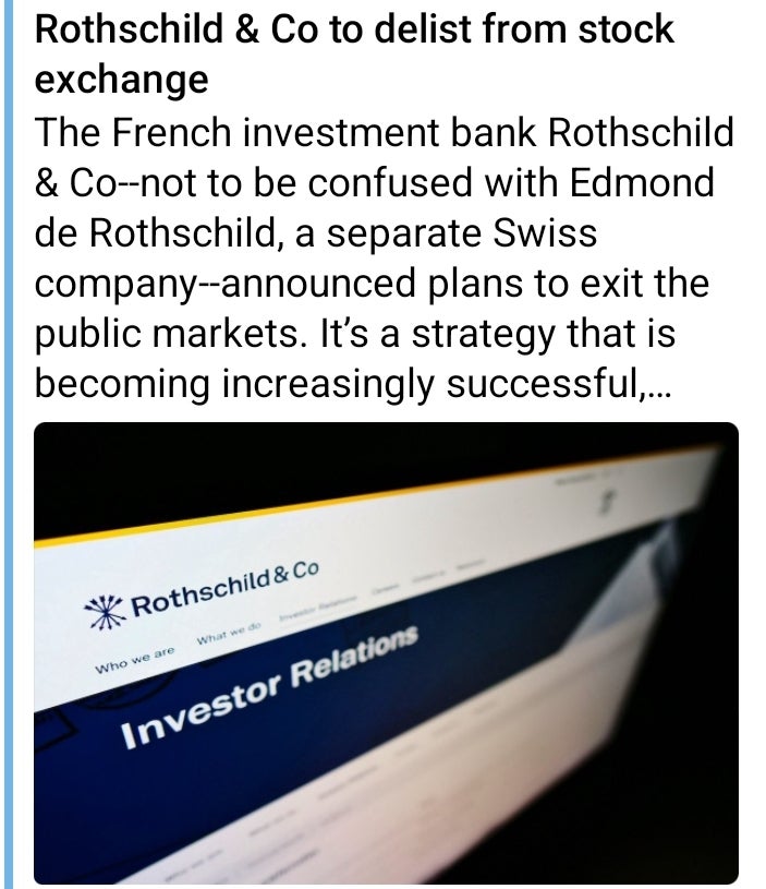 A. ロスチャイルド・アンド・カンパニー、株式上場廃止へフランスの投資銀行であるロスチャイルド・アンド・カンパニーは、スイスのエドモンド・デ・ロートチャイルドとは別会社であり、株式市場から撤退する計画を発表しました。この戦略は、ますます成功しつつあります。