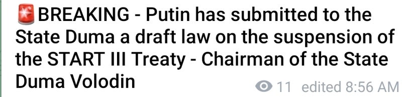 C.  プーチン大統領は、スタート III 条約の停止に関する法律案を国家議会に提出しました。