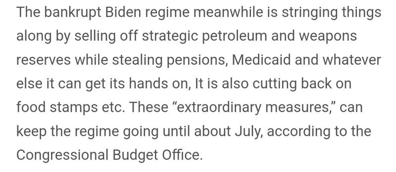 B. 一方、破綻したバイデン政権は、戦略的石油と武器の備蓄を売り払いながら、年金やメディケイド、その他手に入るものは何でも盗んで、事態を引き延ばしています。