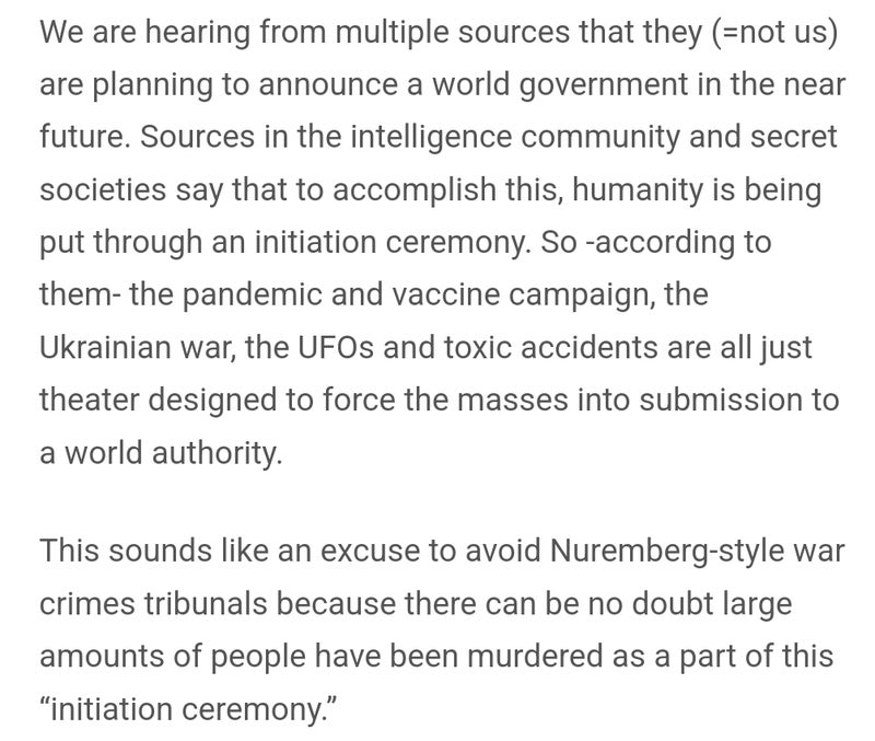 つまり、パンデミックやワクチンキャンペーン、ウクライナ戦争、UFOや毒物事故はすべて、大衆を世界的権威に服従させるために作られた劇場だと言うのです。