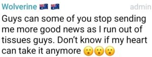 F. みんな、ティッシュが足りなくなってきたので、これ以上いいニュースを送ってくるのをやめてくれないかなー。