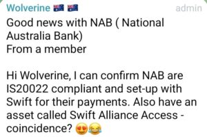 メンバーからこんにちは、ウルヴァリンさん。NABはISO20022に準拠しており、支払いにスイフトを使用していることが確認できます。また、スイフトアリアンスアクセス-と呼ばれる資産も持っています。偶然の一致ですか?