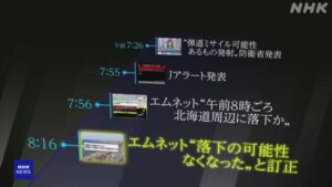 その後、情報を確認したところ当該ミサイルについては北海道及び、その周辺への落下の可能性がなくなったことが確認されましたので訂正します」と改めて発表しました。