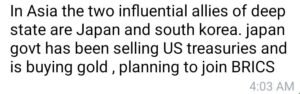 これは、日本、台湾、オーストラリア(アジア)を含む東アジアの大きな動きの一部であります。C. アジアでは、ディープステートの有力な同盟国は日本と韓国であります。日本政府は米国債を売り、金を買い、BRICSへの加盟を計画しています。