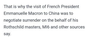 A. フランスのエマニュエル・マクロン大統領が中国を訪問した理由は、ロスチャイルドの主人に代わって降伏交渉をするためだったと、MI6などが伝えています。